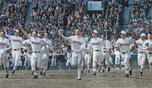 2009年開幕試合で勝利して応援席に向かう倉工ナイン。 胸に「KURASHIKI」の文字がよみがえる。